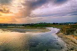 Falling down the 80-metre Mahon Falls and proceeding past a hawthorn "Fairy Tree", identified by ribbons tied to its branches (the tree was chopped down and replanted), the river then passes through the village of Mahon Bridge and on past Flahavan's Mill and under the 8-arched rail bridge in Kilmacthomas. The river is joined by the Ách Mór tributary river at Ballylaneen and ends its journey three miles further downstream at Bunmahon on Ireland's south coast. It drains into the region of the Atlantic Ocean known as the Celtic Sea.