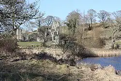 On the north bank of the river, 0.75 miles (1.2 km) north-west of Downpatrick, the Inch Abbey site was originally on an island (Irish: Inis) in the Quoile Marshes. The pre-Norman Celtic monastic settlement here, known as Inis Cumhscraigh (or Inis Cuscraidh),[1] was in existence by the year 800. In 1002 it was plundered by the Vikings led by Sitric,[2] King of the Danes, who came up the Quoile with a fleet from the sea. The Vikings plundered the settlement again in 1149.[1]