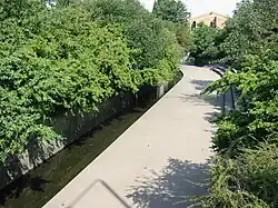 Taking an almost straight south-flowing course, the Rom passes under the London Loop and experiences a drop of 24 metres (79 ft) in elevation before it enters the ringroad enclosed town centre of Romford where it becomes underground in a culvert, a man-made tunnel, at 16m AOD.[1] To the south of the town centre it regains green banks and adjoins the retail park on Rom Valley Way, passes under Roneo Corner, divides two residential estates at 8m AOD and enters Eastbrookend Country Park where it is joined by a tributary, The Ravensbourne that has flowed through Emerson Park (a residential area) and then a park, Harrow Lodge Park, from its source in Ardleigh Green.[n 2][2]