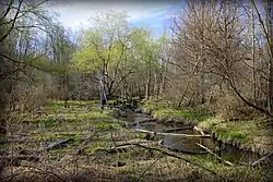 Ingersol Creek at Novi. Note riparian buffer. Just outside the frame are a rail line and residential, industrial, and public recreation facilities