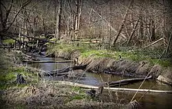 Ingersol Creek at Novi, close-up demonstrating wildlife habitat. At the time of this photo the city had begun tree removal and road construction within the greater riparian zone.