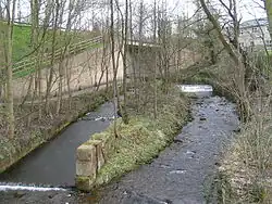 ![]() The Sett passes under the A624 Hayfield "bypass". The tower of St. Matthew's church can be seen through the trees in the background, and in the foreground are the scanty remains of Walk Mill. | |