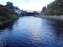 At the southern end of Loch Shin lie the dam and power station which were constructed in the 1950s, and which raised the level of the loch. The architecture is of a high quality with a prominent copper roof, as the structures form a focal point for the village of Lairg.[13] Below the dam is Little Loch Shin, which is immediately to the west of Lairg. It is crossed part way down by the A839 road, and ends at the dam, from which water enters a tunnel to feed the power station at Inveran, and compensation water is released to maintain the flow on the River Shin.[14]