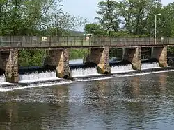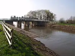 The river passes over weirs at Greenham, Tone and Nynehead, after which it is crossed by the Bristol and Exeter Railway. A disused bridge, constructed in 1817,[9] spans the river at Nynehead.[10] The river turns to the north-east near Bradford on Tone, with its two listed bridges, including the Bradford Bridge which was originally built by the 15th century,[11][12] and then to the east near Upcott bridge, where there were two mills. At Roughmoor its course is crossed by Silk Mills Road. There is a scheme to make the river navigable from here to the town centre as a way of encouraging transport with less environmental impact.[13]