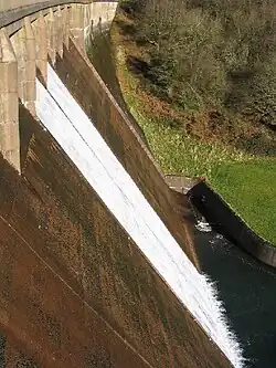 The river continues as the outflow from the main dam of the reservoir, passing to the west of the village of Clatworthy before following a southerly course which passes to the east of Huish Champflower. The river enters a steeply wooded section at Washbattle bridge.[6] The B3227 road from Wiveliscombe crosses from the east to the west side of the valley at Waterrow bridge. By the time it reaches Stawley bridge and turns south-east,[2] it has lost another 410 ft (120 m) and is just 330 ft (100 m) above sea level. At Greenham, the river turns to run generally north-east. The river passes to the north of Wellington, and a mile further on the course of the derelict Grand Western Canal crosses the Tone on an aqueduct which now carries a footpath.[7][8]