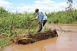 In the past the Yala River flowed through the eastern 20% of the Yala Swamp into Lake Kanyaboli, then into the main swamp, and then through a small gulf into Lake Victoria. Today the eastern part of the swamp has been drained, and the river flows directly into the 80 square kilometres (31 sq mi) main swamp. It is cut off from Lake Kanyaboli by a silt-clay dyke. Lake Kanyaboli now receives its water from the surrounding catchment area and from back-seepage from the swamp. The river's gulf has been cut off from the lake by a culvert, which created the 5 square kilometres (1.9 sq mi) Lake Sare through back-flooding.[7] Lake Sare, with its direct link to Lake Victoria, is important in preserving the cichlid fish fauna of Lake Victoria.[8] The river water enters Lake Victoria from Lake Sare through a channel crossed by a bridge that carries the C27 coastal highway along the Goye causeway.[9][10]
