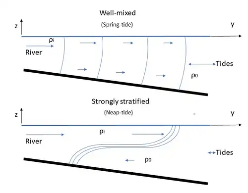 A tidal cycle consists of a flood period or landward flow, and an ebb period or seaward flow.[15] For constant river discharge one can find a stable stratification during ebb conditions and an unstable stratification during flood conditions.[11] This is schematically portrayed in the figure to the right. The mixing that occurs during flood conditions due to the unstable stratification weakens the stratification and efficient river plume advection[11] and occurs in situations with low estuarine Richardson numbers.