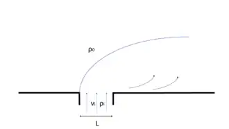 In the near-field the momentum of the plume is larger than its buoyancy. This balance is represented in the (dimensionless) Froude number, and is larger than one in the near-field, indicating supercritical flow. Both the liftoff point and the outer boundary of the near-field, the plume front, are characterized by critical flow conditions () and the flow in the near-field region shows features similar to a jet.[8] The momentum balance is dominated by barotropic and baroclinic pressure gradients, turbulent shear stresses, and flow acceleration. Flow deceleration is mainly caused by the shear stresses on the interface of the plume with the ambient ocean. In some cases a near-field region will not exist. This is for example the case if the width of the river mouth is large relative to the Rossby radius of deformation, , and the fresh water inflow will leave the river mouth as a far-field plume. When tides are large, the near-field plume is also known as the tidal plume.[9]