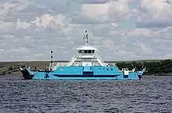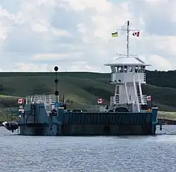 The Riverhurst Ferry is Saskatchewan's largest ferry, with a length of 35.6 metres (117 ft), a width of 14 metres (46 ft), and a load limit 90.7 tonnes (89.3 long tons; 100.0 short tons). It carries a maximum off fifteen cars on each crossing.[1] It is powered by a computer-controlled engine and powers a central drive cable. There are three guide cables, two mounted one foot from the left and right sides, and a middle cable running underneath the hull.