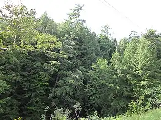 The forest is near the northern limit of the hemlock's range.[4] Studies of pollen and tree trunks preserved in peat indicate that white pine preceded hemlock in the region, but the percentage of hemlock increased about 5,700 years ago. The two species may have formed mixed stands, as in the ecological reserve.[5] Through most or all of the last 2400–2100 years hemlock was the dominant tree species in the region. The Rivière-du-Moulin forest is old-growth, at least 1,000 years old. Recurring surface fires have rejuvenated the structure of the forest by killing almost all plants growing in the shade on the floor of the forest, letting the hemlocks regenerate.[6] Analysis of charcoal fragments indicates that up to 30 fire events could have happened since the mid-Holocene, with more events in recent years after European settlement in the region.[7]