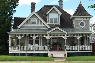 Built in 1900, the house is a 1+1⁄2-story frame residence in Queen Anne Revival style with Eastlake gallery curving around the front and side of the house. The roofline features a square corner turret with an oculus and a pyramidal roof.[2]