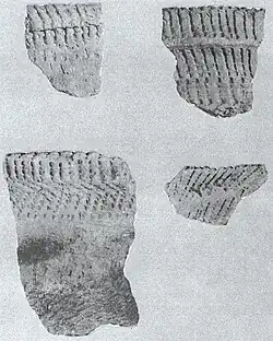 53 vessels of Wayne ward were recovered. Wayne ward is characterized by globular to slightly elongated vessels with constricted neck and outflared rims; grit-tempered with fine to medium grains; rims are plain and rarely decorated; and almost never castellated or collared. Surface finish is generally cordmarked. This type is similar to the "generalized woodland" or generic grit-tempered cordmarked vessels typical of the transition from Middle Woodland to Late Woodland.[1][6]