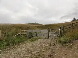Belmont Road (USRN 7400767) and Roynton Road (USRN: 7400820) are the two roads that provide access to the hillside, the Terraced Gardens, the Pike and Winter Hill from the direction of Chorley, Belmont and Horwich. Both are open public roads recorded on the National Street Gazetteer which are public and under the control of the Lancashire County Council with adopted status and statutory protection by way of the Highways Act 1980. Gates placed on these roads must not be locked shut.[28][29][30] The speed advice is a maximum of 5 mph. Belmont Road forks at the Pigeon Tower. The descending road has washed away. The continuation of the road to the right heads to Rivington Road and is now a dirt track across Rivington Moor. Roynton Road provides access across the lower part of the hillside and connects Rivington Lane to Sheep House Lane, via seven arch bridge.[31]