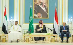 ![]() Mohammed bin Salman, Muhammad bin Zayid, and Abdrabbuh Mansur Hadi attending the signing ceremony of the Riyadh agreement | |