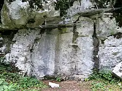 In an abandoned quarry below the church an ancient relief of the god Mithras sacrificing a bull, with the cult characteristic images of Cautes and Cautopates, Sol, a scorpion, a snake, a dog, and a raven, indicate this was the site of a late second-century Mithraeum.[4]