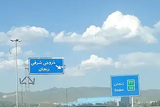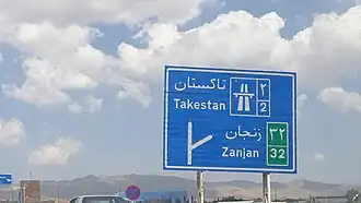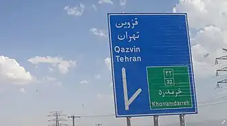 Road 32 is a road in the northwest of Iran . This road goes parallel and in line with Freeway2 from Tehran to Karaj, Hashtgerd, Abyek, Qazvin, Takestan, Abhar, Khorramdarreh, Zanjan, Mianeh, Tabriz, Marand, Mako and finally to Bazargan and the Turkey border . This road is a part of the Asian highway1, which is 260 km long, and connects Tabriz to Bazargan connects Iran and Turkey border . This road passes through six provinces of Tehran, Alborz, Qazvin, Zanjan, East Azerbaijan and West Azerbaijan and is 880 km long.[1]