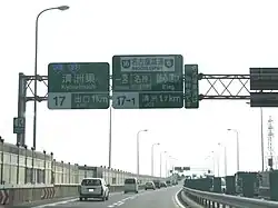 Guide signs (案内標識, an'nai-hyōshiki) indicates directions or distances of the road. Guide signs have dark green backgrounds and white text for expressways. In urban areas and on national highways, direction signs have dark blue backgrounds. The signs are normally written in Japanese and English. Since 2014, Vialog is used as the typeface for English words and Place name Transcriptions.[7]