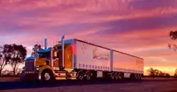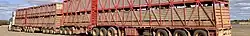 A road train, also known as a land train or long combination vehicle (LCV), is a semi-trailer truck used to move road freight more efficiently than single-trailer semi-trailers. It consists of one semi-trailer or more connected together with or without a prime mover.[1] It typically has to be at least three trailers and one prime mover. Road trains are often used in areas where other forms of heavy transport (freight train, cargo aircraft, container ship) are not feasible or practical.