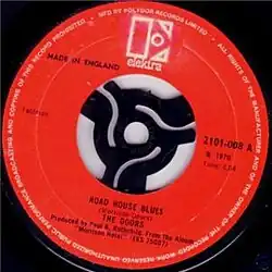 "Roadhouse Blues" is a song by the American rock band the Doors from their 1970 album Morrison Hotel. It was released as the B-side of "You Make Me Real", which peaked at No. 50 on the U.S. Billboard Hot 100[5] and No. 41 in Canada.[6] "Roadhouse Blues" charted in its own right on the Cash Box Top 100, peaking at No. 76.[7] The song became a concert staple for the group and it has been covered by numerous artists.
