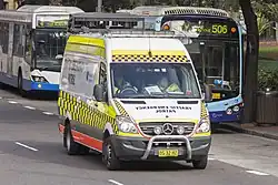 Traffic Commanders take command of traffic management arrangements at an incident (such as a motor vehicle collision) and liaise with other response agencies such as the Police, and assist in clearing the road and minimising the effects and disruption to traffic.[9] Traffic Commanders exercise command and control of RMS resources at the outer perimeter with regard to traffic management such as the coordination of Traffic Emergency Patrols.[10] Traffic Emergency Patrols vans patrol major road routes and respond to unplanned incidents with the aim of returning the road to normal operating conditions as soon as possible.[8] Both Traffic Commanders and TEP units carry a wide array of traffic management devices such as traffic cones, barrier boards and road signage.[11] Both also are permitted to use and display red and blue emergency lighting and are designated as 'emergency vehicles'.[12]