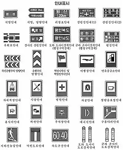 The red circle signs with the number inside indicate the speed limits. On motorways, the usual limit is 80 km/h and 100 km/h for the right-hand lanes. The rightmost lane of a motorway is sometimes, as on the Pyongyang-Myohyang motorway, limited to 60 km/h near the junctions of the slip roads.