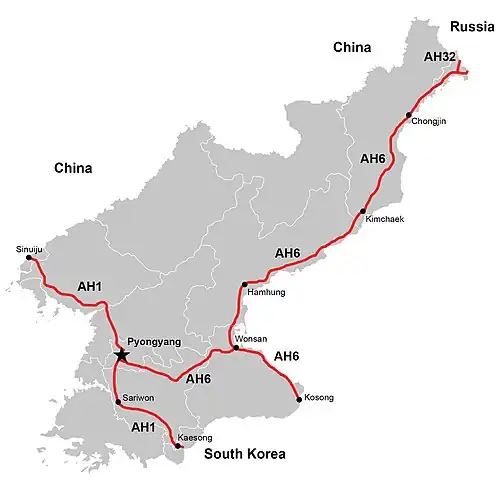 | AH6 | Kosong – Wonsan (– Pyongyang) – Chongjin – Sonbong – Khasan – Border with Russia | 855 |