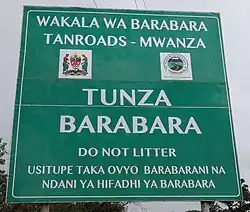 Trunk roads in Tanzania were marked by numbers following the two-tier number system with prefixes A- and B-, as is practiced in the rest of East Africa.[8] Following is the list of Tanzanian trunk roads.[9] Meanwhile, Tanzania has introduced a numbering system for trunk roads using numbers starting with "T"[10] but so far the "A" designations are visible if at all.