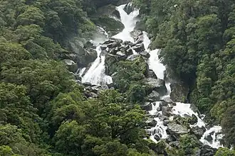 Roaring Billy Falls is a waterfall in Mount Aspiring National Park, Westland District, New Zealand. It is located in the Haast River valley, around 30 km (19 mi) inland from Haast, near Eighteen Mile Bluff on State Highway 6. The falls are a 30-metre-high (98 ft) cascade on The Roaring Billy stream.[1][2] The bottom of the cascade is at an elevation of around 80 metres (262 ft) where it flows into the Haast River.[3]