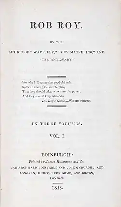 Rob Roy is an 1817 historical novel by Walter Scott, one of the Waverley novels. It is probably set in 1715, the year of the first Jacobite rising, and the social and economic background to that event are an important element in the novel, though it is not treated directly.[2] The depiction of Rob Roy bears little relation to the historical figure: "there are two Rob Roys. One lived and breathed. The other is a good story, a lively tale set in the past. Both may be accepted as ‘valid', but they serve different needs and interests."[3]