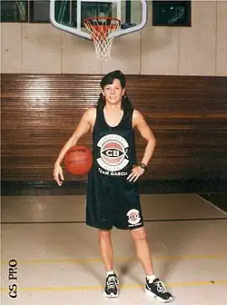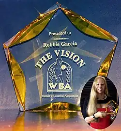 Garcia played on several professional basketball teams and leagues, including the 1993 Champion Kansas Crusaders, Kansas City Mustangs and Tulsa Flames of the WBA.[23] She also played in The Pro-Am, AAU Women's League, Guadalupe, Mexico, British Columbia,[24] and was chosen to play in the Liberty Basketball Association (LBA) professional league.[25] Garcia's Kansas Crusaders team won the first WBA Championship in 1993. Her Kansas City Mustangs team won the regular WBA season going undefeated 15–0 in 1994.[26] Garcia was a 4-time WBA All-Star[27] and is featured on the collector WBA All-Star Card Set by Fair Play Sports.[28][29] She is quoted several times and highlighted with five photos and a three-page spread in the 2017 best-selling book and documentary film The Vision: The Untold Story of the Women's Basketball Association by Lightning Ned Mitchell.[30] In addition, Garcia was awarded the oldest women's sports award of Women's Basketball AAU Athlete of the year in 1992[31] while playing on her Championship Kansas City AAU Team.[32][33]