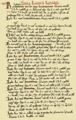 Robert Bastard (fl.1086) (also known as Robert le Bastard, Latinised as Rotbertus / Robertus Bastardus[1]) was a Norman warrior who assisted in the 1066 Norman Conquest of England under King William the Conqueror. He was subsequently rewarded with landholdings in Devonshire and is one of the Devon Domesday Book tenants-in-chief of that monarch,[2] with a holding of 10 manors or estates held in chief, 8 of which he held in demesne, i.e. under his own management without tenants. He had at least one[3] further holding as a mesne tenant, at Goosewell, Plymstock parish, Plympton hundred, held from William of Poilley, a Norman tenant-in-chief from Poilley in Normandy, most of whose 21 landholdings were later granted by King Henry I (1100–1135) to his trusted supporter Richard de Redvers (died 1107), feudal baron of Plympton[4] in Devon.