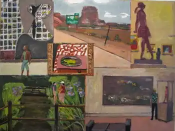 In the 1990s, and 2000s, Brokl's painting and drawing has often been inspired by travels to Greece, India, Italy, Morocco and Spain; this work often fuses multiple images in surrealist-like collages, "puzzles" or grids that suggest narrative, dream states and the contemporary bombardment of sensations, as in the large oil, Domestic Travel VII (2008).[31][52][53][26] His exhibitions at the SFMOMA Artist Gallery (1993, 1999) and paintings in the 1994 show "Dream Riddle" featured fragments of masterworks, such as Michelangelo's David, as well as Greek vases, Roman sculpture and Indian miniatures, which function as symbolic icons in meditations on mortality, human existence and the AIDS crisis.[31][54][52] Writer Jennifer Modenessi describes the show, "Viaggi Artistici" (2002, with M. Louise Stanley) as a "fantastic voyage where past and present overlap and collide", noting his "Egypt" series, which combines impressionistic images of outdoor monuments, museum interiors and silhouettes of tourists.[53][26] In the 2000s, Brokl has also explored portraiture (e.g., Joan Brown, 2005), often in multi-panel formats (e.g., Six Modern Heads I, 1999).[55][56]