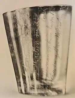This is one of the oldest glass engraving techniques, practiced by the ancient Romans probably using flint and in the mid-sixteenth century in England and Holland using diamond tipped tools and a stipple technique to produce landscapes, portraits, still life, etc.[2] Old glass has a higher lead content than the present day and this generally made scribing easier and more fluid in its execution.[5]