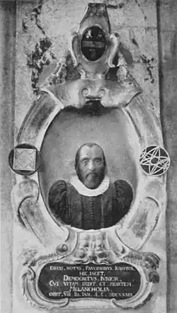 Burton drew up his will on 15 August 1639. Five months later, aged 62 and on 25 January 1640, he was dead. The will divided his inherited estates up amongst his elder brother, William, and William's heirs. Outside of his family, his largest bequests went, unsurprisingly, to the Bodleian and Christ Church libraries, with gifts of £100 each, and Burton's large library split between the institutions. He also laid out several smaller monetary donations: those to his servants; the servants at Christ Church; the poor in Seagrave, Nuneaton, and Higham; the library at Brasenose; and various friends and colleagues, including John Bancroft.[67] Burton was buried in the north aisle of Christ Church Cathedral, Oxford, on 27 January.[68] William erected a monument to Robert Burton in the cathedral: a coloured effigy of Robert, flanked by an astrological representation of his nativity and geometric instruments, with a short Latin epitaph below, said to have been composed by Burton.[69][70]