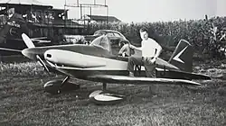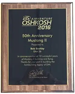 The FAA pre-cover inspection of the first wing of his prototype Midget Mustang was January, 1953. Bob built his prototype version of the Midget, N15J, and first flew it on September 9, 1959.[4] In 1959 he purchased the rights to the Midget Mustang and began to sell prints for the M-I. In San Antonio, Texas, he built six Midget Mustang aircraft. In 1963 he began work on a two place design based on the Midget Mustang. In 1965 the first ever Mustang II (N1117M) was brought to the EAA convention at Rockford (by trailer) and in 1966 the prototype was flown to the convention.[5] For the next 26 years Bushby Aeronautics sold plans and kits for the Mustang II. In March, 1992 Mustang Aeronautics, Inc. acquired the design rights from Robert Bushby for both the Midget Mustang and Mustang II aircraft.[6] At the Homebuilder's Dinner at EAA AirVenture Oshkosh 2016, Bob received special recognition from the EAA commemorating 50 successful years of his Mustang II design.[7]