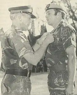![]() Squadron Commander Capt. Robert C. MacKenzie receives the Silver Cross of Rhodesia in 1979, "for conspicuous gallantry and leadership in action." | |