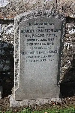 He died on 3 February 1949 and is buried in Currie Churchyard south of Edinburgh. The grave stands on the north wall of the modern cemetery, backing onto the old churchyard.