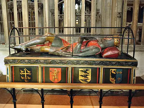 Robert died in Cardiff Castle, probably on 3 February 1134. He was buried in Gloucester Abbey.[27] The exact place of his burial is difficult to establish—legend states that he requested to be buried before the High Altar. His effigy carved in bog oak adorns a mortuary chest decorated with the attributed arms of the Nine Worthies (missing one—Joshua, and replaced with the arms of Edward the Confessor). The effigy dates from about 100 years after his death and the mortuary chest much later. The church subsequently became Gloucester Cathedral.