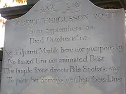 The poet Robert Burns privately commissioned and paid for a memorial headstone of his own design in 1787, which was erected in 1789. The stone was restored in April 1850 by the poet Robert Gilfillan.[11] In the later nineteenth century, Robert Louis Stevenson intended to renovate the stone, but died before he could do so. The epitaph that Stevenson planned to add to the stone is recorded on a plaque added to the grave by the Saltire Society on the Society's 50th anniversary in 1995.