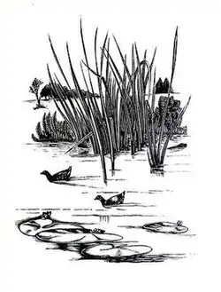 Gibbings had begun to take part in natural history trips to the Thames organised by the university. He later wrote: "In the early days of 1939 there arose in me a great desire to find peace beside a river".[4] Along with Patrick and two other helpers he built himself a boat, the Willow, and floated down the Thames. The result was Sweet Thames Run Softly (1940). He took the title from Edmund Spenser's Prothalamion: "Sweete Themmes! runne softly, till I end my Song". His observations and wood engravings of the countryside, the river and its natural history, were the fruits of gentle months spent on the Thames, accompanied by sketch pad and microscope. Written at a time of great insecurity, the book captivated readers, acutely aware that the world it portrayed was in imminent danger of being wiped out. Thomas Balston wrote of Gibbings: "Few readers in these harassing days escape the longing for a simpler life, and Gibbings is very much a modern Thyrsis."[14] He had captured a moment shared by many other people at the time, and over 140,000 copies of the book were printed.[7]