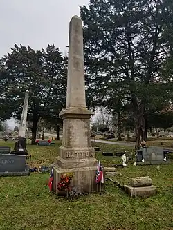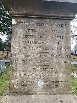 His body was returned to Tennessee for burial, but because Middle Tennessee was occupied by Federal troops, he was temporarily buried at Knoxville. On March 23, 1866, he was reburied in Lebanon's Cedar Grove Cemetery. A statue of him was erected in Lebanon's town square in 1912.[11]