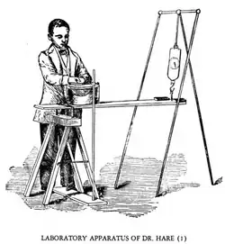 Hare was born in Philadelphia, Pennsylvania, on January 17, 1781. He developed and experimented with the oxy-hydrogen blowpipe, with Edward Daniel Clarke of Oxford, shortly after 1800. He married Harriett Clark and had six children. In 1802, Hare was elected a member of the American Philosophical Society. He was a professor at the University of Pennsylvania between 1810 and 1812 and between 1818 and 1847. By the 1820s, Hare had developed the "galvanic deflagrator", a type of voltaic battery having large plates used for producing rapid and powerful combustion.[2] He was elected an Associate Fellow of the American Academy of Arts and Sciences in 1824.[3]