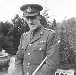 Still serving in Palestine upon the outbreak of the Second World War, the battalion moved, in January 1940, to Brigadier Cyril Lomax's 16th Brigade. In April he returned to the United Kingdom and, on 24 April, was promoted to the acting rank of brigadier, and took command of the 160th Infantry Brigade, a Territorial Army (TA) formation then serving in Northern Ireland with its parent unit, the 53rd (Welsh) Infantry Division, then commanded by Major General Bevil Wilson. On 12 September 1942, promoted to acting major general,[17] he became the GOC of the 53rd Division, succeeding Major General Gerard Bucknall.[4] His rank of major general was made temporary on 12 September 1943,[18] and permanent on 12 December 1944 (with seniority backdated to 3 February 1944)[19]