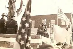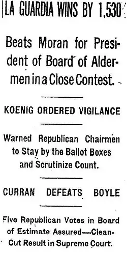 In 1919, Moran was chosen by Tammany Hall to run as the Democratic candidate to succeed himself as president of the Board of Aldermen in the November election.[2] Moran's republican opponent was United States Congressman and former Deputy New York Attorney General Fiorello H. LaGuardia.[4] Michael "Dynamite Mike" Kelly, the popular commander of New York's Third "Shamrock" Battalion, also joined the race on the ticket of the Liberty Party.[15] Kelly was a war hero and recipient of the Distinguished Service Cross and Croix de Guerre. His campaign was supported by the notorious Jeremiah A. O'Leary and a small group of Irish Americans who opposed the League of Nations and advocated recognition of the Irish Republic. Tammany looked with alarm upon Kelly's entrance into the campaign and tried to persuade him to withdraw his candidacy and throw his support behind Moran. When he refused, the Tammany chiefs went to the New York Supreme Court to remove Kelly's name from the ballot, pointing out that 547 of the 3,491 signatories to Kelly's nomination petition had failed to register or otherwise comply with election laws. The Supreme Court agreed and ordered that Kelly's name be stricken from the ballot, a ruling later upheld by the Appellate Division.[4]