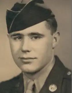Regt., 78th Inf. Division, participating in an attack on the German Wehrmacht in the Hürtgen Forest in the Ardennes. Freezing cold -- snow covering everything -- in the pre-dawn darkness a flare fired from the German lines suddenly lit up the area and revealed my company moving down a road – mortar shells and 88 shells began to fall in our midst almost immediately. My friends started dropping all around me – several killed instantly, others fatally wounded. I felt a blow on my left leg like someone had hit me with a baseball bat. I hit the ground and crawled off the road into a low spot. I realized I had dropped the spare barrel for my machine gun and crawled back out on the road and retrieved it. The company commander (Captain Brey – later killed instantly) came up and told us to go with him and he would deploy us in the woods. We went in and established our line and came under machine gun fire and mortar fire and more of our company were killed. The captain told us to dig in and I started to dig a foxhole in the frozen ground but by this time my leg really hurt and I couldn’t stand on it and my boot was full of blood. I crawled over to Captain Brey and told him I had been hit in the leg and he told me to go back to the battalion aid station, which was several hundred yards back near the area where I was wounded in the first place. I had to crawl on my stomach the whole way as the area was under heavy fire but I made it. The medic at the battalion cut off my boot and bandaged my leg and gave me some sulfa pills. Then they put me in a jeep with some other wounded guys – a couple of stretchers and the jeep tore off at high speed for the regimental aid station under artillery fire most of the way. We finally made it to the aid station set up in a house and there were a couple of surgeons there working on the most severely wounded. There were quite a few bodies there and numerous guys with severe head or chest wounds and obviously dying. I was put in an ambulance with several others and taken to a railhead where hospital trains were taking the wounded back into France. I don’t remember too much about that except a nurse came around every few hours and gave me a shot of penicillin (pretty new stuff then) and we finally arrived at Paris where we were taken to a large hospital. A chaplain came around one day with a copy of general orders awarding a bunch of us the Purple Heart. I still have my copy. After a week some of us were flown over to England in DC-3s. I remember all the air force crew had parachutes but none of us wounded had one. I asked one of the crew what we did if the Luftwaffe shot us down. He said “tough shit buddy.” Fortunately, we made it and when I arrived at the hospital in England I was pretty sure that I had probably survived the war. When I look back and realize how close I came to death at the age of 19 it doesn’t seem possible that I
