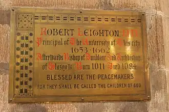 Robert Leighton (1611 – 25 June 1684) was a Scottish prelate and scholar, best known as a church minister, Bishop of Dunblane, Archbishop of Glasgow, and Principal of the University of Edinburgh from 1653 to 1662. He was "noted for his Christian piety, his humility and gentleness, and his devotion to his calling".[1]