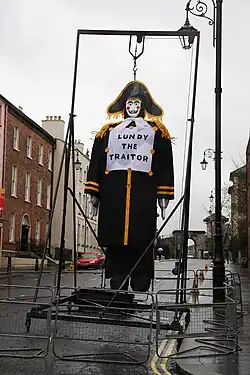 Lundy is reviled in Ulster loyalism as a traitor to this day, and is burned in effigy during the celebrations to mark the anniversary of the shutting of the gates of Derry in 1688.[17] Much like Judas, his name has become a byword for "traitor" among unionists and loyalists.[18] Ian Paisley regularly denounced people, including Margaret Thatcher, Terence O'Neill and David Trimble, as "Lundies".