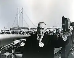 ![]() Moses in 1939 with a model of his proposed Battery Bridge | |