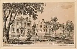 The Murrays lived north of "town" (now called Lower Manhattan), in what was considered the country.[11] They lived on their 29-acre estate called Belmont, also known as Inclenberg (Dutch for beautiful hill), in Murray Hill. The area named for the Murrays.[8][11] Their two-story house, built about 1762,[8] sat at what is now the corner of 37th Street and Park Avenue. It was situated with the East River on the east side.[11] Extensive gardens and lawn on the north and south sides,[11] overlooked Kips Bay and the East River.[7][8] An avenue of spruce, elm, magnolia, and poplar trees led to the residence.[11] The Murrays entertained international travelers, like the Tunisian ambassador, who arrived in New York with letters of introduction for the Murrays.[11]