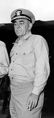 In February 1944, he joined the staff of the Commander in Chief, U.S. Fleet, in Washington, D.C., as head of New Developments, and with his promotion to flag rank in April 1945, assumed command of Amphibious Group 14. Victory over Japan Day found him in Manila, working on plans for the invasion of the Japanese homeland.[2]